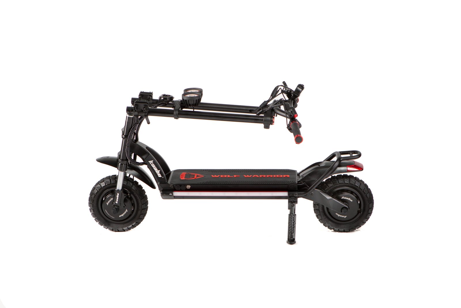 Wolf Warrior 10X with turn signal lights! Wolf Warrior 10X is the lightest off-road electric scooter from the Kaabo series, with two motors of 1100W nominal power (over 4400W total peak power). The scooter is offer with two types of batteries - DMEGC Li-ion battery of 60V /28Ah SAMSUNG and LG .